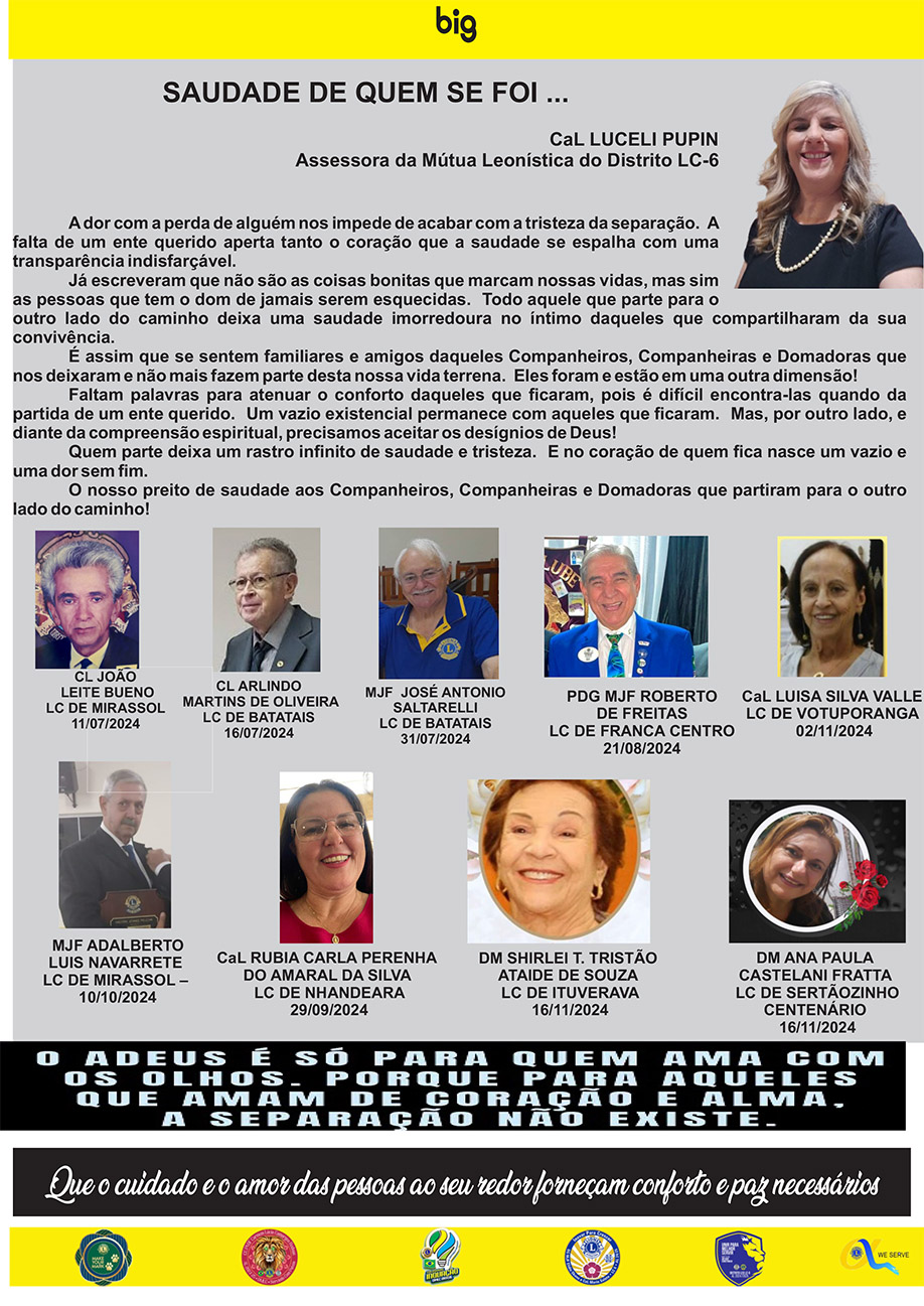 Video de homenagem apresentado na 2a. DISTRITAL DO LC-6, realizada em OUROESTE-SP, dia 08 de dezembro de 2.024, aos CCLL e CCaLL falecidos neste segundo trimestre do AL 2024/2025 –