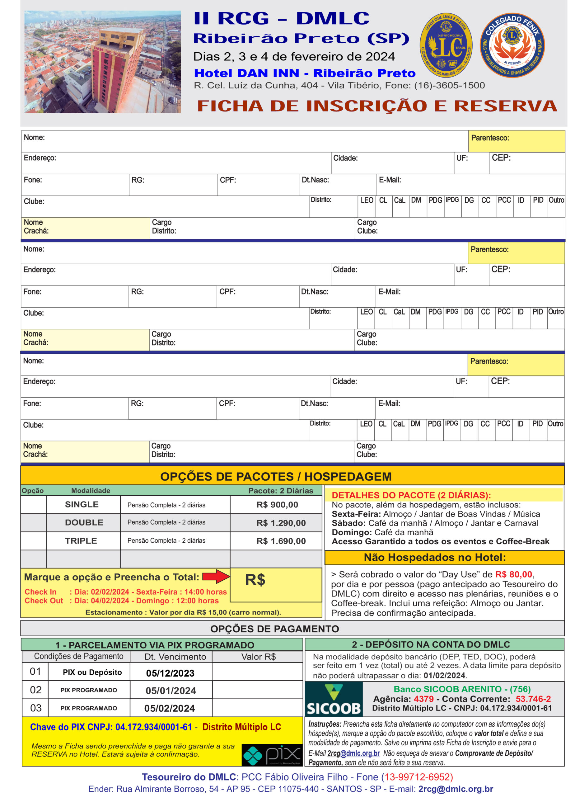 Já disponibilizado a Ficha de Inscrição e Reserva (ao lado). Clique no botão (Baixar), preencha a ficha no seu próprio computador e envie-a no e-mail: 2rcg@dmlc.org.br, com as opções de pagamentos preenchidas.