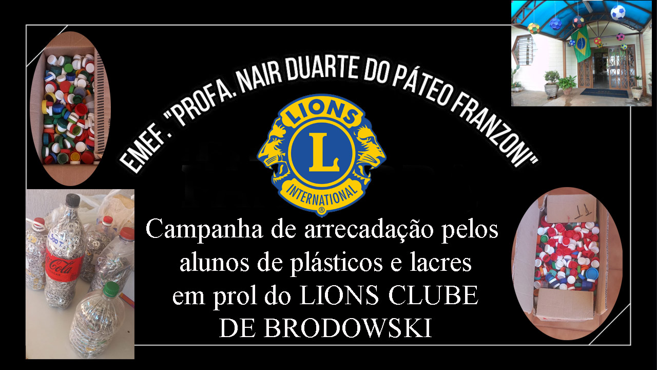 Mesmo durante o periodo de férias escolares, os alunos da EMEF PROFA. NAIR DO PÁTEO FRANZONI trabalharam com afinco na campanha de arrecadação de tampinhas de plásticos e lacres de aluminio em prol do LIONS CLUBE DE BRODOWSKI, os quais serão transformadas em conjunto com as demais doações, em cadeiras de rodas e banho. O LIONS agradece a todos esses alunos, à diretora Flávia Rossi e professoras