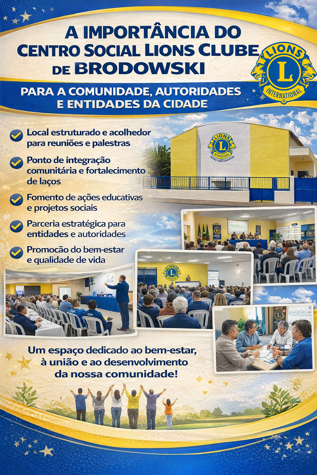 O LIONS CLUBE DE BRODOWSKI está totalmente empenhado em uma reforma completa no CENTRO SOCIAL LIONS CLUBE DE BRODOWSKI, cuja construção iniciou em 1.982, sendo inaugurado em 1.988, com a troca do reboco das paredes internas e externas, com a melhoria dos banheiros, incluindo um para deficientes e outras melhorias.