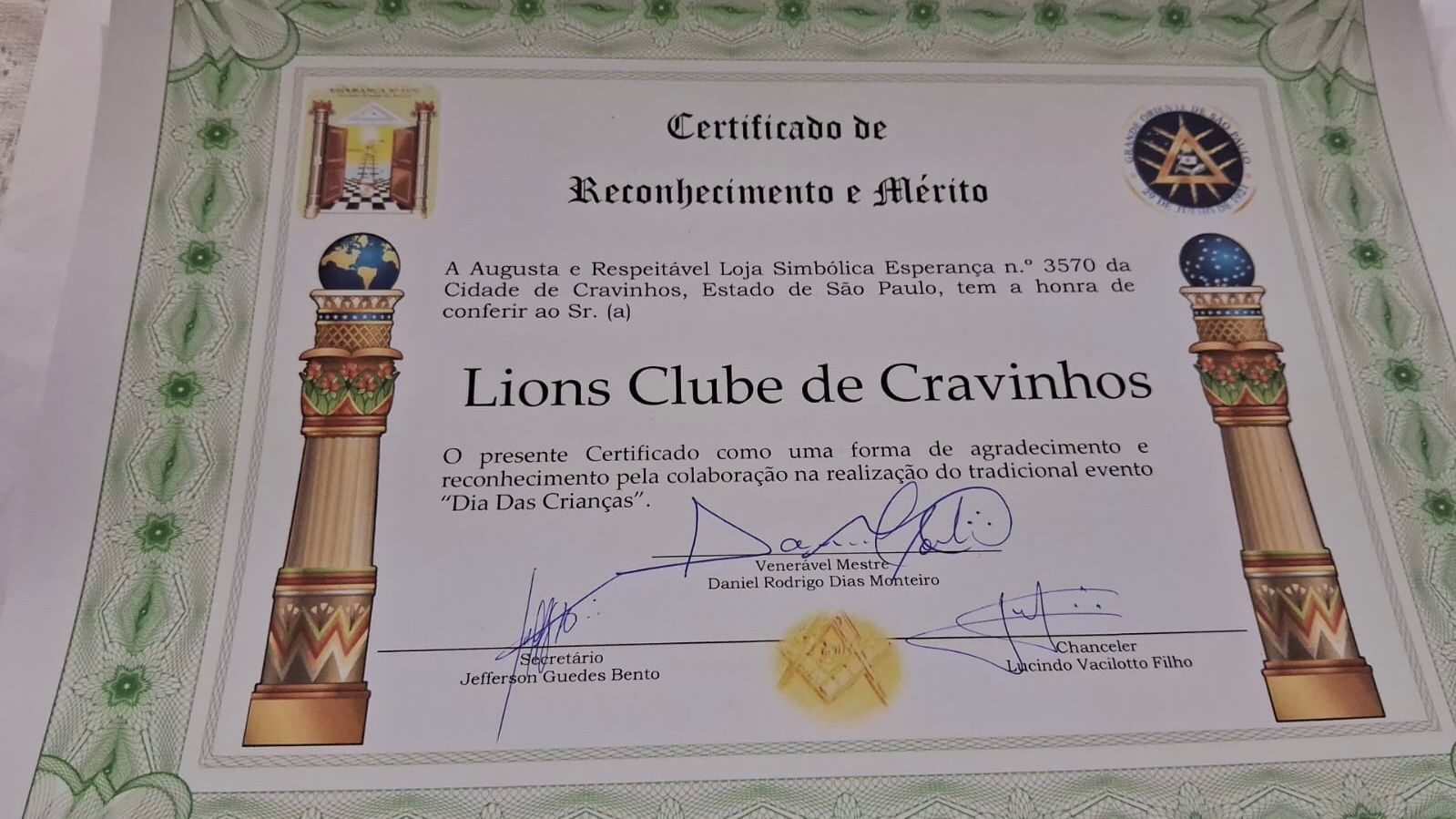 No última terça-feira, dia 27 de agosto, o Lions Clube de Cravinhos e o LEO Clube de Cravinhos, representados pelo DG CLMJ Elídio Okano, Governador do Distrito LC-6, CL Vanderlei Carniel, Presidente e o CLMJ Rogério Thomazelli, Diretor Social, participaram de uma reunião na Loja Maçônica Esperança onde receberam certificados de reconhecimento e mérito como uma forma de agradecimento pela colaboração na realização do tradicional evento “Dia das Crianças”, realizado no dia 12 de outubro de 2023, no Parque Ecológico Dr. Renato Pagano.