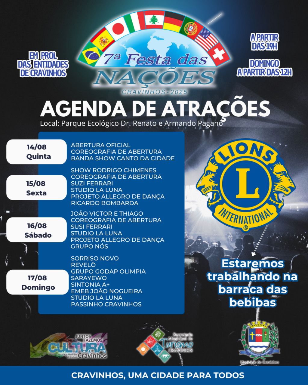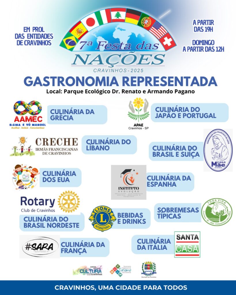 A administração municipal de Cravinhos, através das Secretarias de Cultura e Turismo, realizará a 7ª Festa das Nações, em que as entidades filantrópicas Casa da Criança, Casa Mãe, Santa Casa, APAE, Creche das Irmãs Franciscanas, ONG SARA, Associação Ambientalista Toda Vida, AAMEC e Casa Abrigo, além dos clubes de serviço Lions Clube e Rotary Club irão retratar diversos países, com sua gastronomia, crença e cultura.