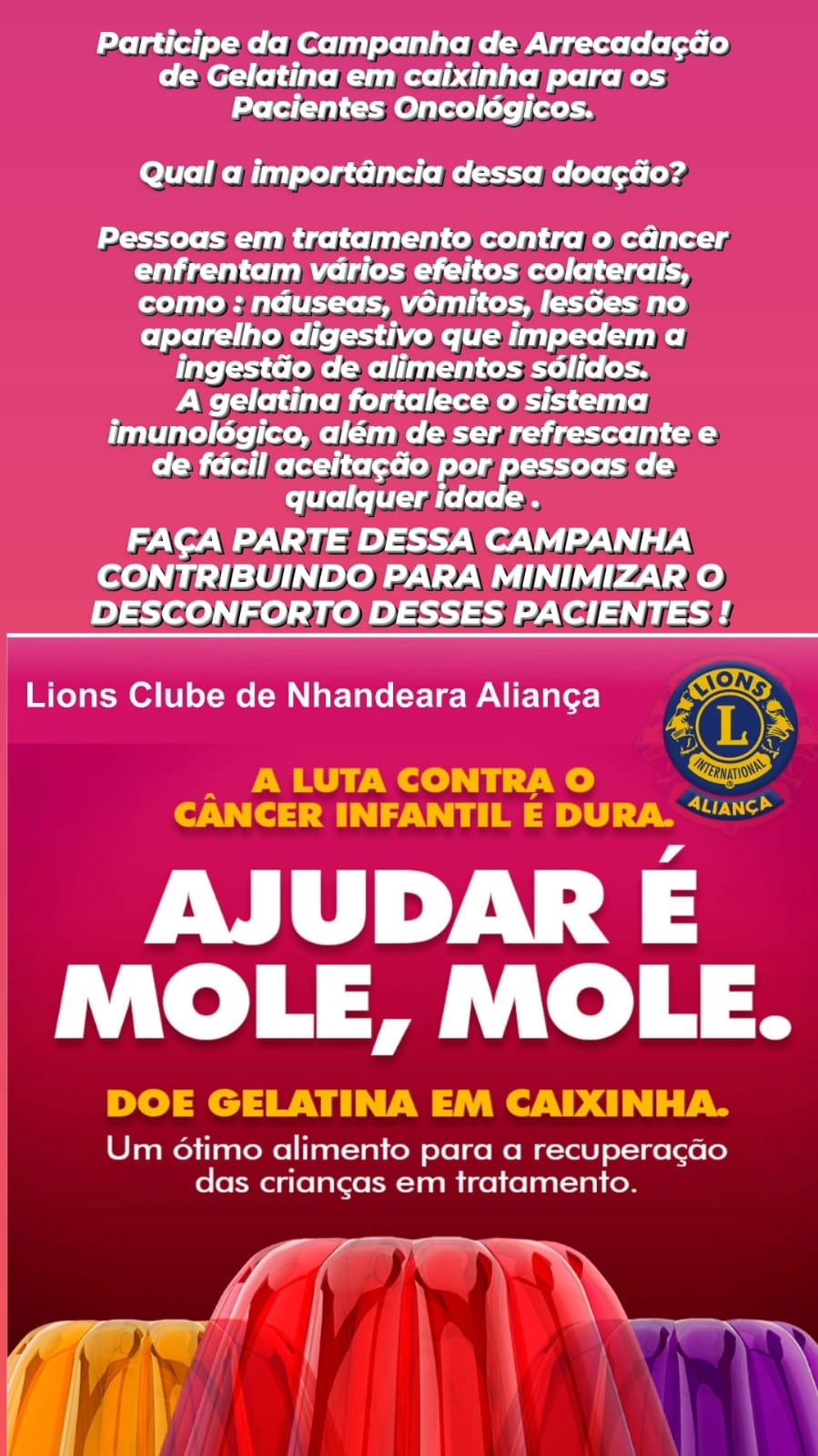 O Lions Aliança iniciará a campanha da gelatina, que será destinada ao Hospital do Câncer. Conseguimos junto à Siamar um preço bem mais em conta: