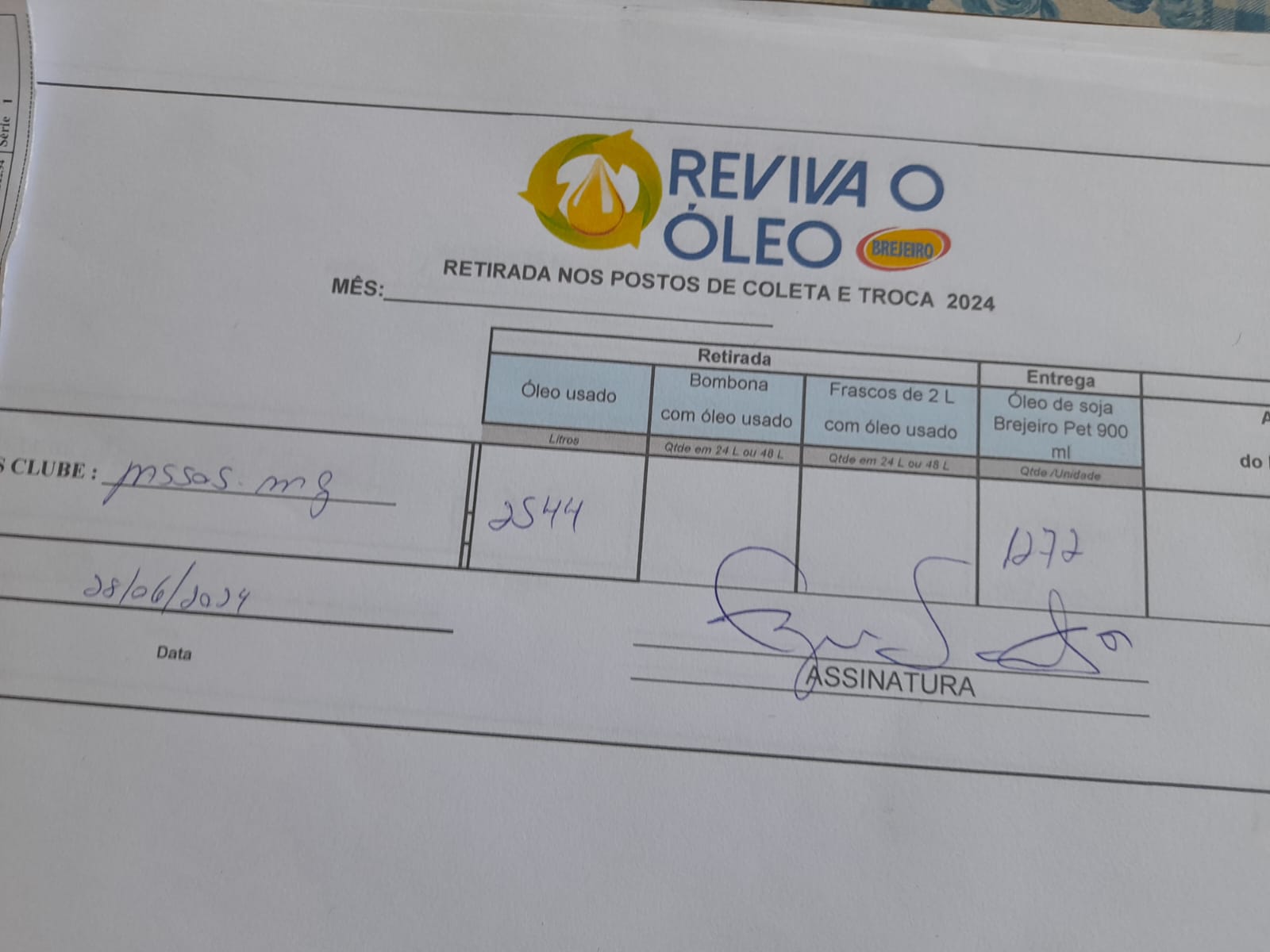 Lions Clube de Passos fêz a entrega hoje, dia 28/06/2024, para a Brejeiro, no projeto REVIVA O ÓLEO, do Distrito LC 6, de 2.544 ltrs de óleo de fritura usado, e recebeu 1.277 lts de óleo limpo que será repassado as famílias carentes.