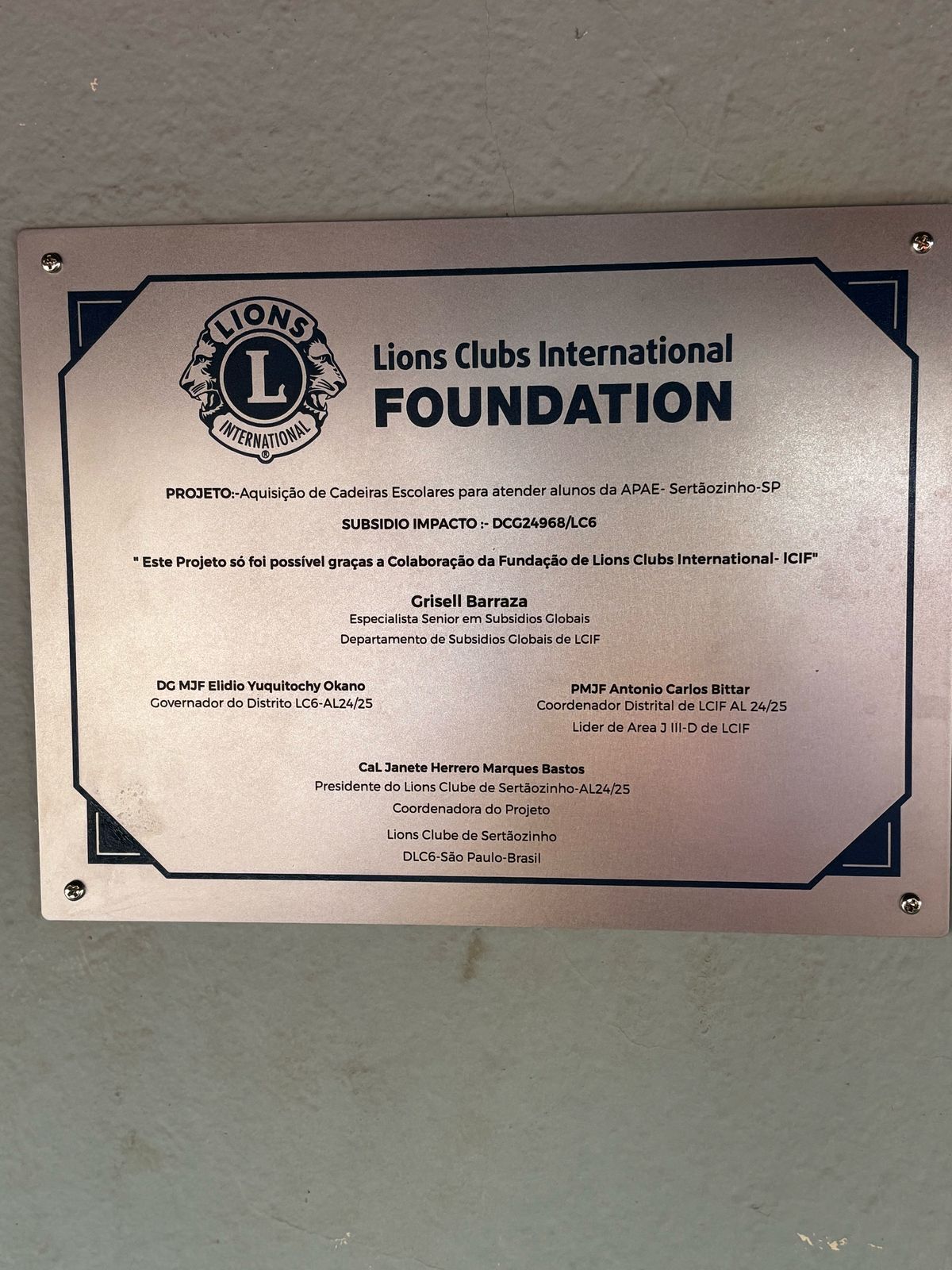 Elídio Yuquitochy Okano distrito LC 6, como também da presidente do Lions Clube de Sertãozinho, Janete Herrero Marques Bastos e seus companheiros de clube, a doação de 130 cadeiras para o refeitório da entidade.