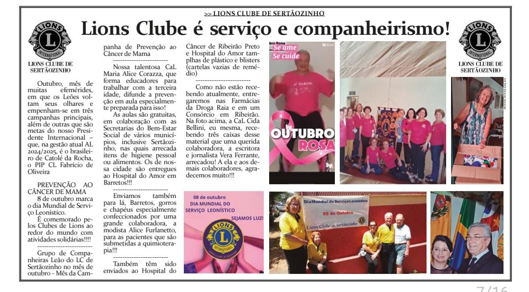 Coluna quinzenal do Lions Clube de Sertàozinho ,publicada no semanário local- Jornal Agora- sob responsabilidade da CaL Maria Aparecida Ortolan Bellini ,que continua com a atividade exercida ,por ano, pelo PDG Bellini.