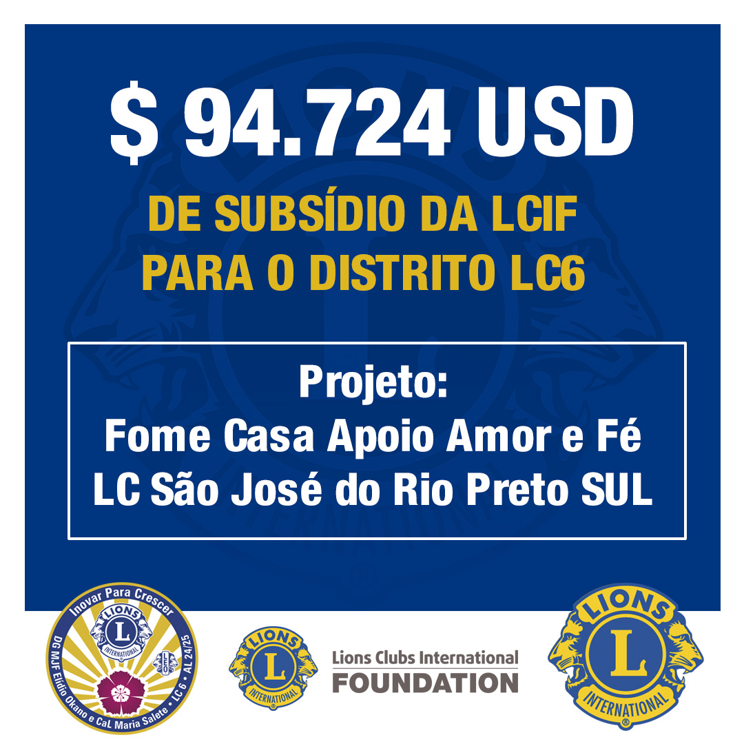 A Fundação de Lions Clubs International (LCIF) liberou subsídios solicitados pelo Distrito LC6 para o projeto: Fome Casa Apoio Amor e Fé – LC São José do Rio Preto SUL.