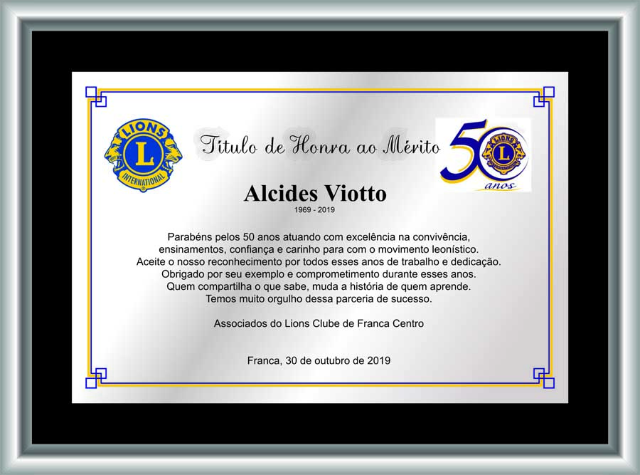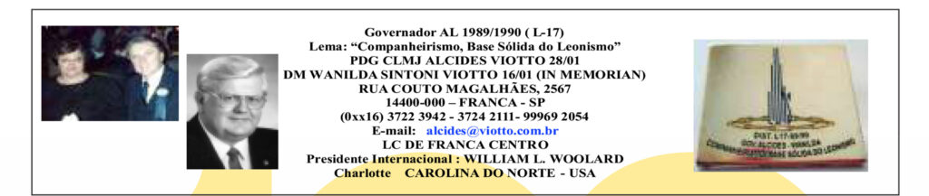 Foi no LC DE FRANCA DO IMPERADOR, que ingressei , na fundação do Imperador, primeira edição. Como ajudei na aglutinação de cidadãos com características ideais para o Lions, fui indicado, ou nomeado para ser o Presidente. Exerci, adorei o nosso movimento e sempre fui muito participativo, chegando aos 57 anos , no LC DE FRANCA CENTRO, em 01/10/1959, aprendendo, ensinando e desfrutando essa maravilhosa filosofia iniciada por Melvin Jones. Agora, ao atingir 91 anos de idade, só me resta, como já escrevi; Agradeço a Deus, à minha família ( nossa pilastra mestre, ao Lions e aos amigos, essa vida maravilhosa que tive, e tenho ainda, sem esquecer das ajudas e apoios que tive da nossa saudosa Wanilda e , agora, dessa pessoa que me atura , estimula e põe pra frente, a minha querida Niobi, com quem estou casado há 10 anos, além dos 5 anos de namoro. Isso é num pouco desse cidadão que ama a Vida, sempre agradecendo a Deus. PDG ALCIDES VIOTTO
