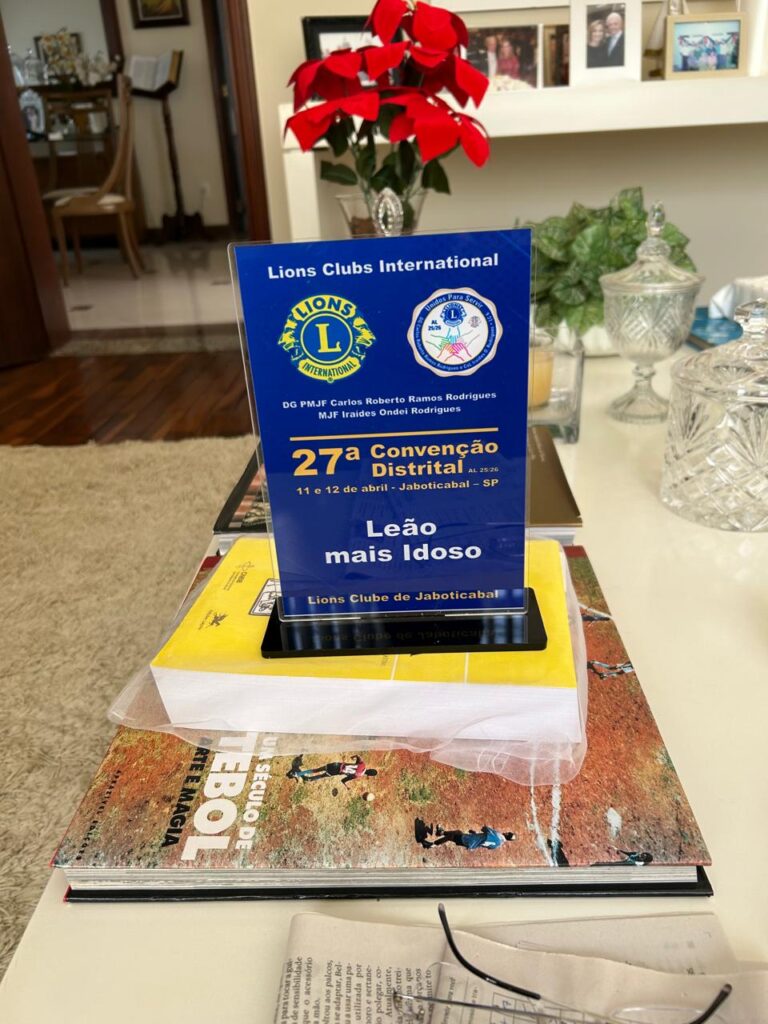 Na 27a. CONVENÇÃO DO DISTRITO LC-6, realizada nos dias 11 e 12 de abril de 2.026, na hospitaleira JABOTICABAL, presidido pelo LEÃO LUCIANO AMORIM BIANCO/DM JANAINE sob a direção do DG PMJF CARLOS ROBERTO RAMOS RODRIGUES, e tendo como diretor o MAURO HENRIQUE CENSO JUNIOR/DM MARIANA, durante a plenaria, o PDG MJF 1989/1990 ALCIDES VIOTO, foi agraciado com um trofeu como o LEÃO MAIS IDOSO, mostrando no alto de seus 91 anos de idade, é um ainda um jovem idealista e sempre presente.