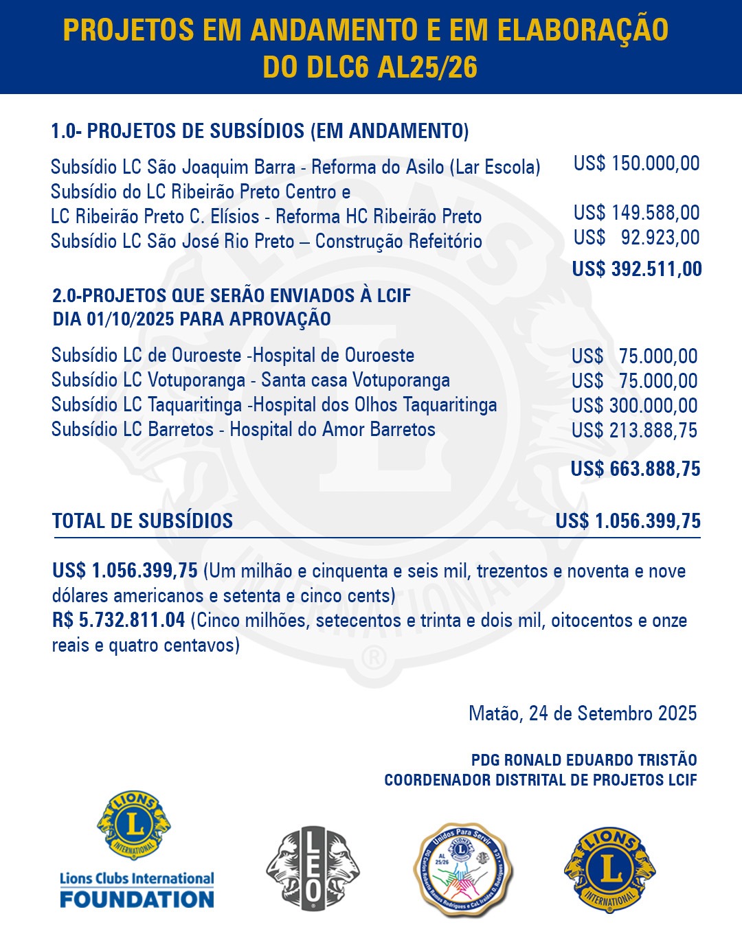 Conforme relatório do PDG RONALD, Coordenador Distrital de Projetos LCIF, que envio abaixo, estamos recebendo muitos subsídios da nossa Fundação, mais de US$ 1.000.000,00.