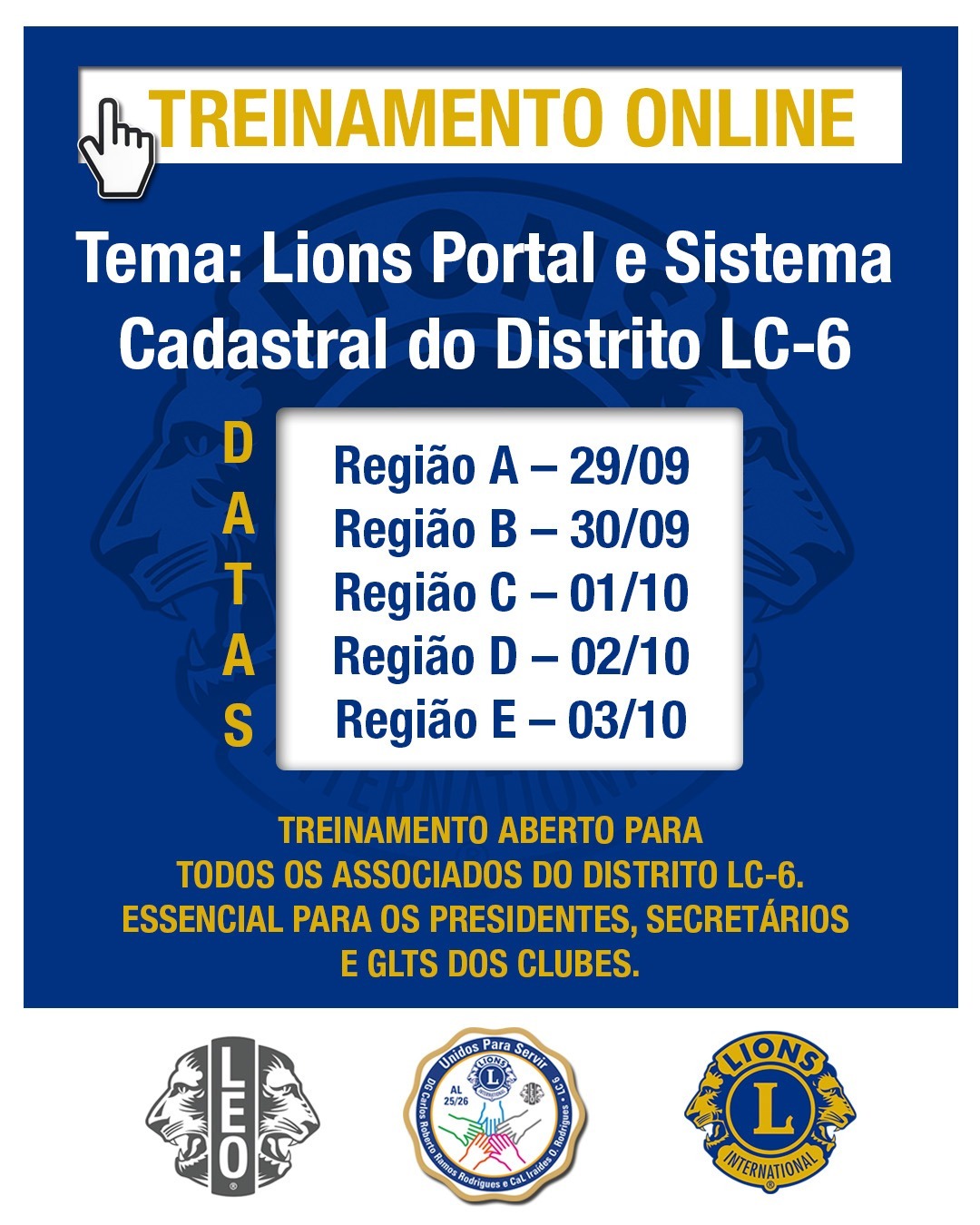 Olá Leões, estaremos ministrando treinamento on line aberto para todos os leões de nosso Distrito LC-6, de maneira especial para os Secretários, GLT´s e Presidentes dos clubes, divididos por Regiões, conforme o cronograma acima.