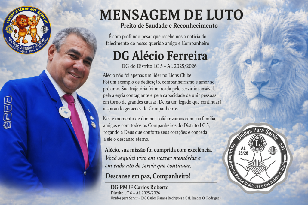É com profundo pesar que comunicamos o falecimento de Alécio Ferreira Guimarães, Governador do Distrito LC5 do Lions Clube Internacional, ocorrido na noite de ontem.