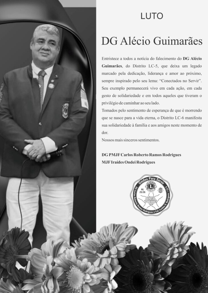 Nota de Falecimento É com profundo pesar que comunicamos o falecimento de Alécio Ferreira Guimarães, Governador do Distrito LC5 do Lions Clube Internacional, ocorrido na noite de ontem. Alécio Ferreira Guimarães foi um líder exemplar, reconhecido por sua dedicação incansável ao movimento leonístico e pelo compromisso com as causas sociais. Ao longo de sua trajetória, […]