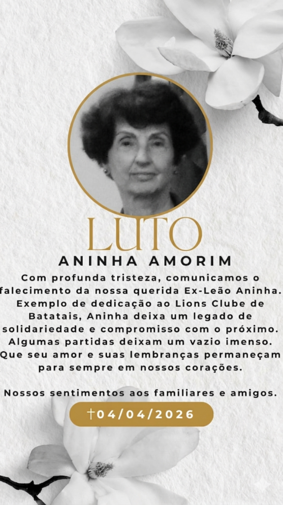 Faleceu no dia 04 de abril de 2.026, a ex Companheira Ana Maria Anaga Amorim ( Esposa do ex Leão Dolivar Amorim )… Associados atuantes do Lions Clube de Batatais durante vários anos. Ambos desligados por motivo de doença. Nossos sentimentos aos familiares em especial ao Dolivar. Que ela descanse na paz do Senhor… Ana