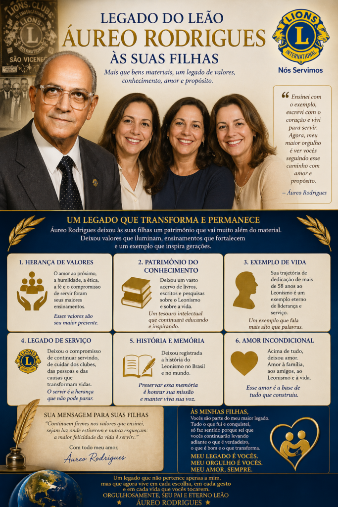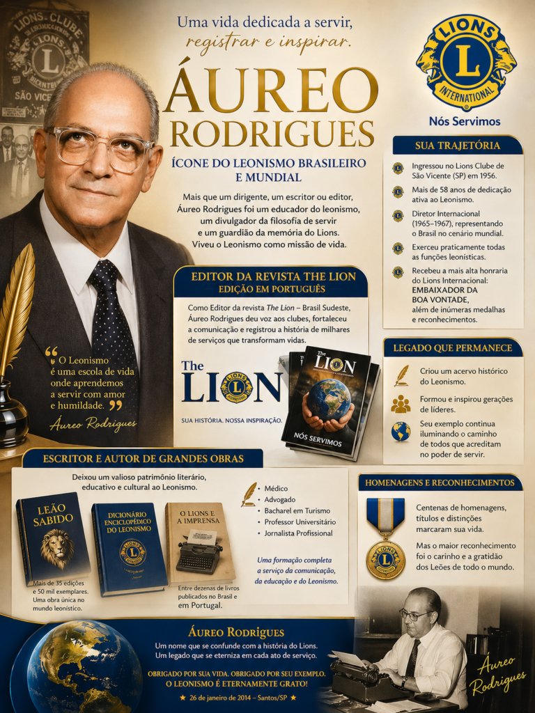 O leonismo brasileiro reverencia, com profunda gratidão e respeito, a memória e o legado do inesquecível Leão Áureo Rodrigues, exemplo maior de dedicação, cultura e amor ao servir.