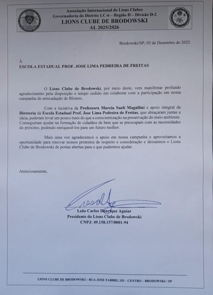 Vendo o trabalho do Lions Clube de Brodowsk através do seu cunhado e sua irmã,Leão Éder e Domadora Mara pelo Lions Clube de Brodowsk,ela teve a iniciativa de levar aos seus aluno a importância que tem o recolhimento seletivo desse tipo de material ( Blisters e tampinhas plásticas) antes de ir para o meio ambiente e o poluir um pouco mais. Com sucesso gerou esse resultado com muita harmonia tanto pela direção da escola quanto pelos alunos. Parabéns a direção da escola por permitir esse tipo de ação,a professora pela iniciativa e os alunos pelo comprometimento.