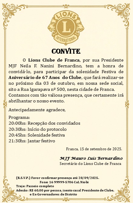Ao Presidente (a)do Lions Clube de Franca. Parabéns Lions Clube de Franca pelos 67 anos prestando grande serviço à Comunidade e em todo nosso Distrito, assim como tb ao LCI. Foi o Padrinho Físico de muitos novos clubes, dentre eles o Lions Clube de Batatais. Além de ter em suas fileiras Leões de Juba Larga, dentre eles PDGs tais como Viotto, enciclopédia Leonistica do Clube e de nosso Distrito. E meu conselheiro, sem vaidade. Esse Clube já teve em suas fileiras outros Leões que foram ícones do nosso movimento, tais como os saudosos PDG Mário Betarello, José Abrão, Saulo, Ademar Polo e outros. Nossa imorredoura gratidão a todos vocês… Aí nasceu a primeira semente que nos lançou como DG. Abs a todos. Ótima Festiva… Maurício/Selma…