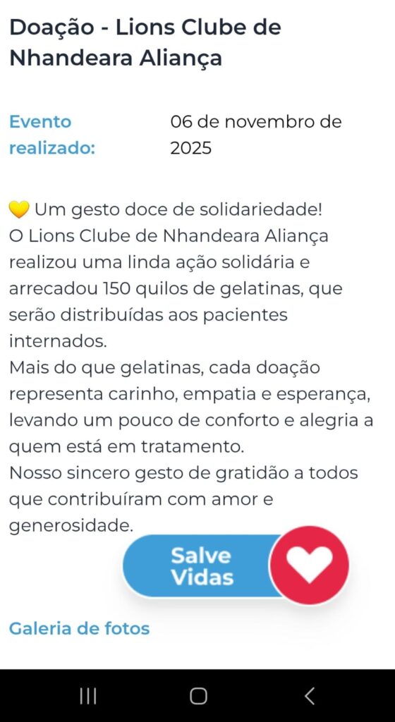 (06/11/2025) o Lions Clube de Nhandeara Aliança entregou no Hospital de Base de São José do Rio Preto a quantidade aproximada de 150 kg de Gelatina, fruto de nossa campanha coletada em nossa cidade.