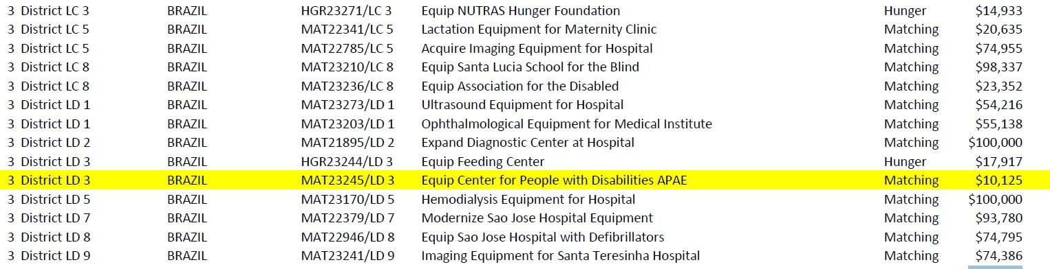 Relação de projetos aprovados da LCIF na reunião de janeiro 2024. Falta nesta relação um projeto Sight First de U$629.434,00 do Distrito LA 5.
