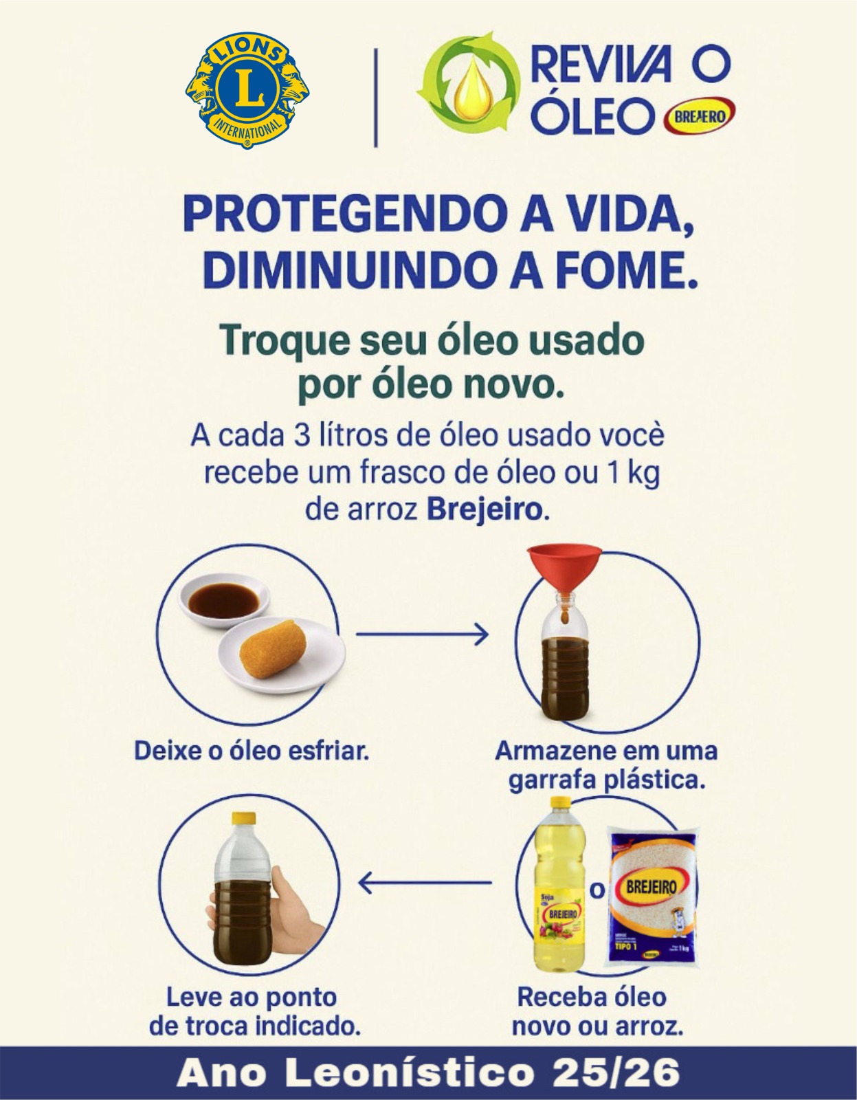 Reviva o Óleo – Protegendo a Vida e Diminuindo a Fome, é uma ação que o Distrito LC-6 desenvolve cuidadosamente, estimulando todos os dias, cada lions clube a envolver sua comunidade em mais um projeto do leonismo.
