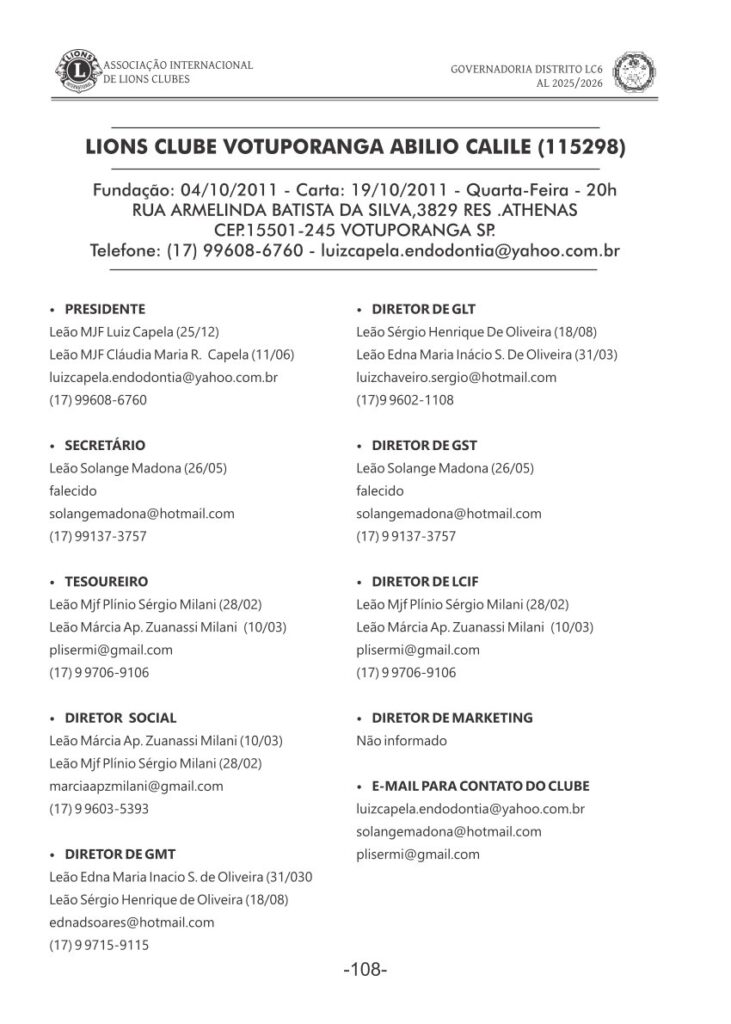 Agradecemos, com profunda gratidão, aos Leões do Lions Clube Votuporanga Abílio Calile, pela calorosa recepção durante nossa visita oficial como Governador do Distrito LC6, realizada no último dia 17/03.